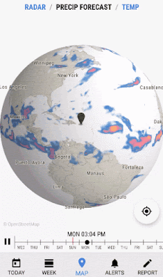 Seleccionando la pantalla llamada Map, te muestra cómo se estará comportando el clima a nivel mundial según el día y la hora. Si agrandas el mapa podrás ver con más detalle cómo se proyecta que será la precipitación en tu área.