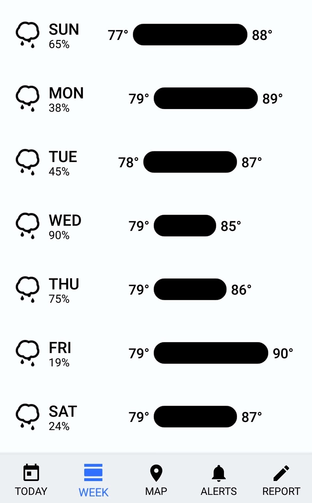 Esta app es muy fácil de utilizar. En una de sus pantallas te indica cómo serán las condiciones del clima para el día. Esto incluye decirte la temperatura según la hora, las probabilidades de lluvia para el día, la velocidad del viento, la humedad y hasta el índice de rayos ultravioletas.